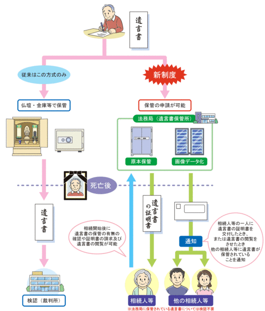 遺言者の死亡後に、相続人や受遺者などは全国にある遺言書の保管所(法務局)において、遺言書が保管されているかどうかを調べることができます。